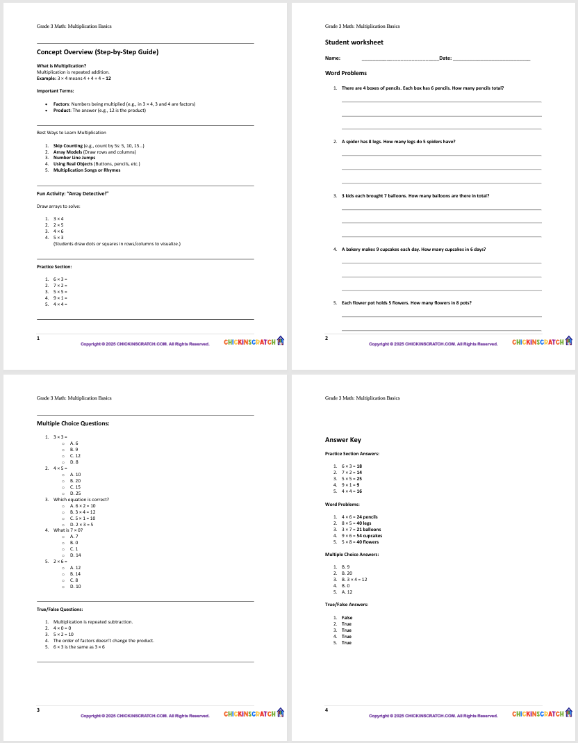 This set of worksheets introduces 3rd graders to the basics of multiplication through fun and easy-to-follow activities. Students will practice repeated addition, equal groups, and simple multiplication facts to build a strong foundation. Includes an answer key for quick and easy checking—perfect for classroom use, homework, or extra practice at home!