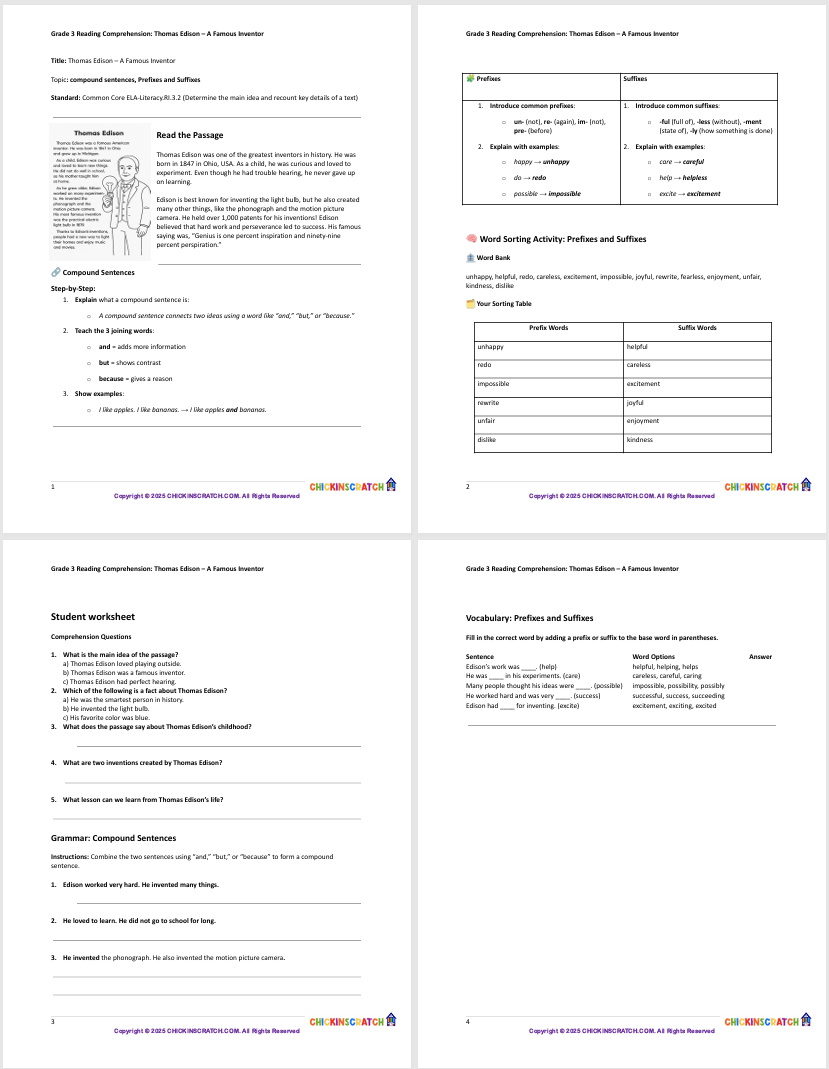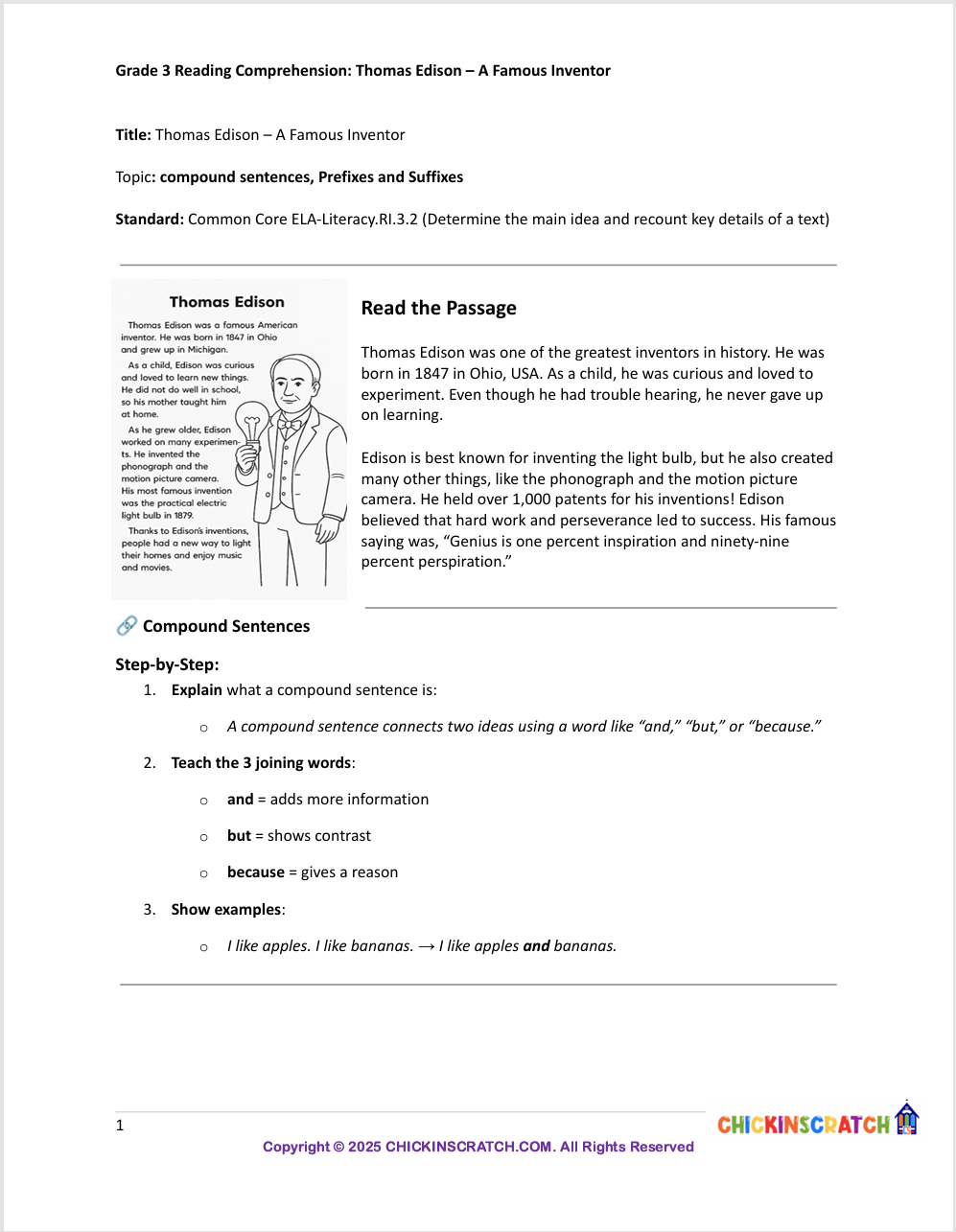 Grade 3 Reading Comprehension: Thomas Edison – Worksheets