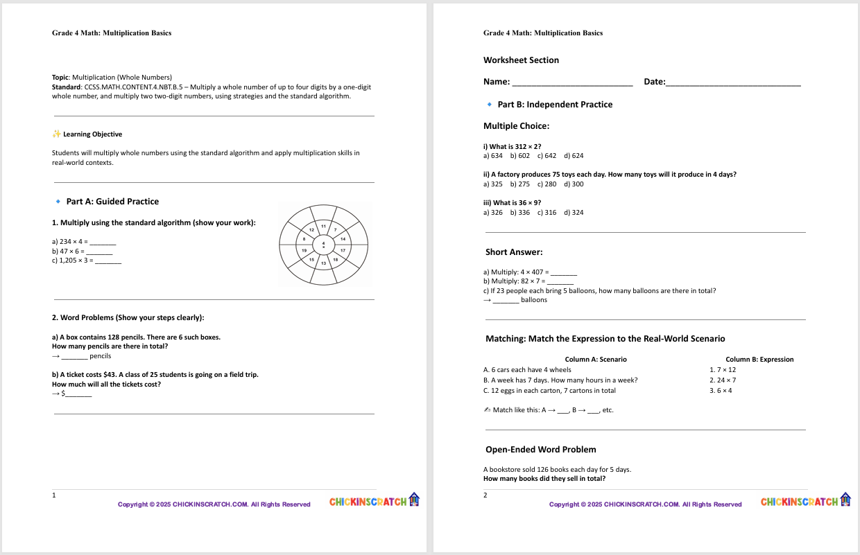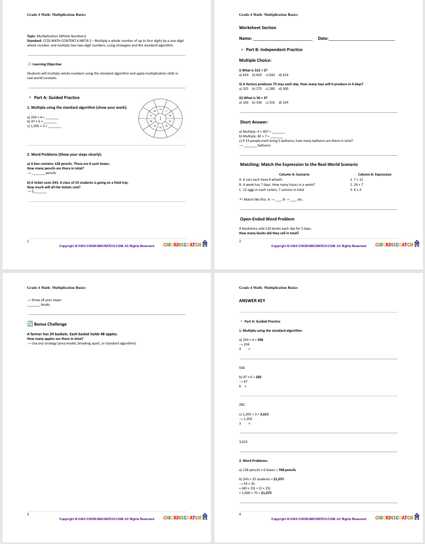 This worksheet set helps 4th graders build confidence with multi-digit multiplication using the standard algorithm and real-world word problems. Students will practice through guided exercises, multiple-choice questions, short answers, matching activities, and a bonus challenge. Aligned to Common Core Standard CCSS.MATH.CONTENT.4.NBT.B.5, this resource includes a complete answer key—perfect for classwork, homework, or extra review!