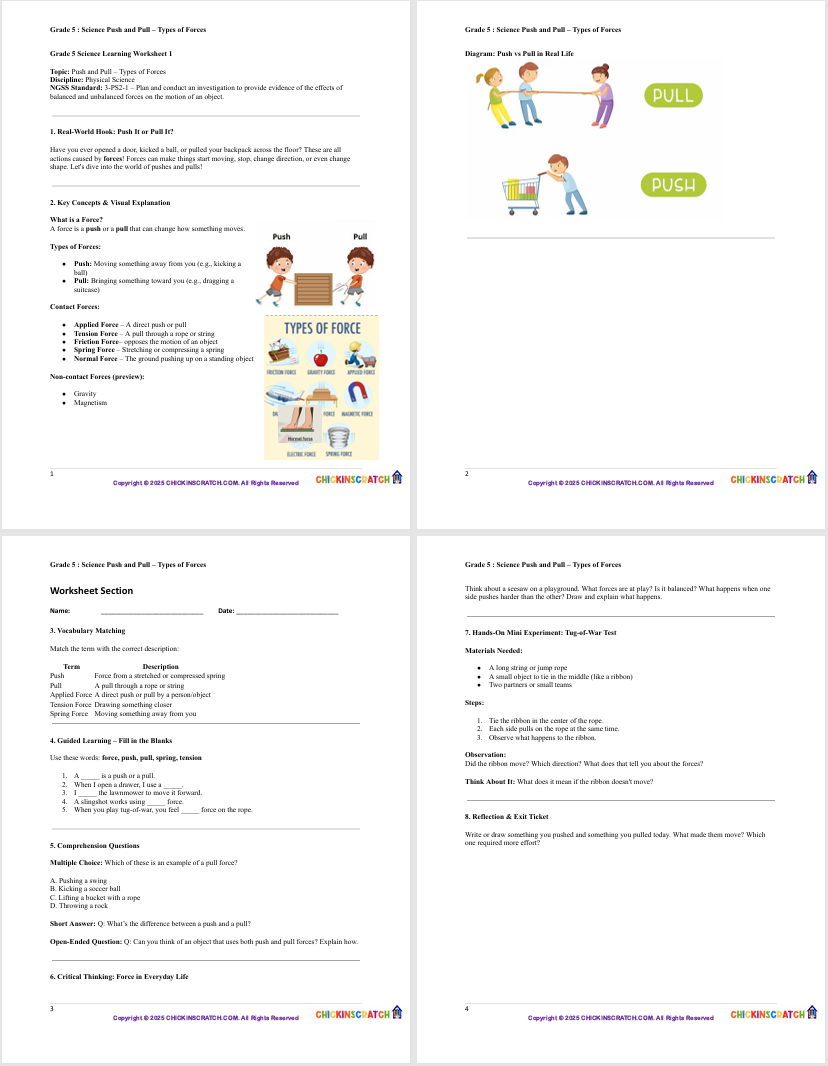 These engaging reading worksheets introduce students to the science of forces, focusing on push and pull concepts. Through easy-to-understand passages and comprehension questions, kids will explore how different forces affect the motion of objects. Designed to support science literacy and critical thinking skills, this resource includes a complete answer key—perfect for classroom lessons, homework, or science centers!