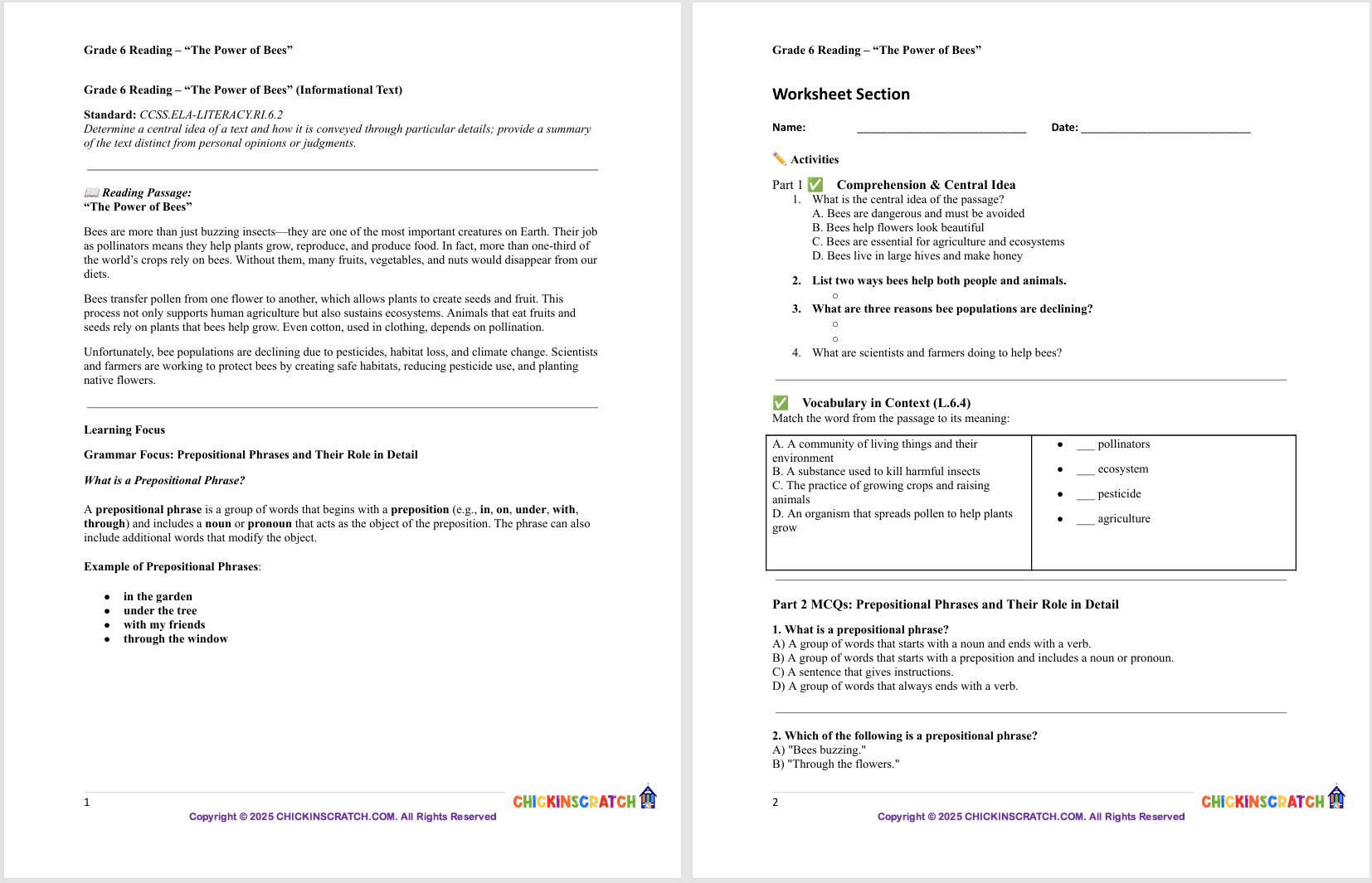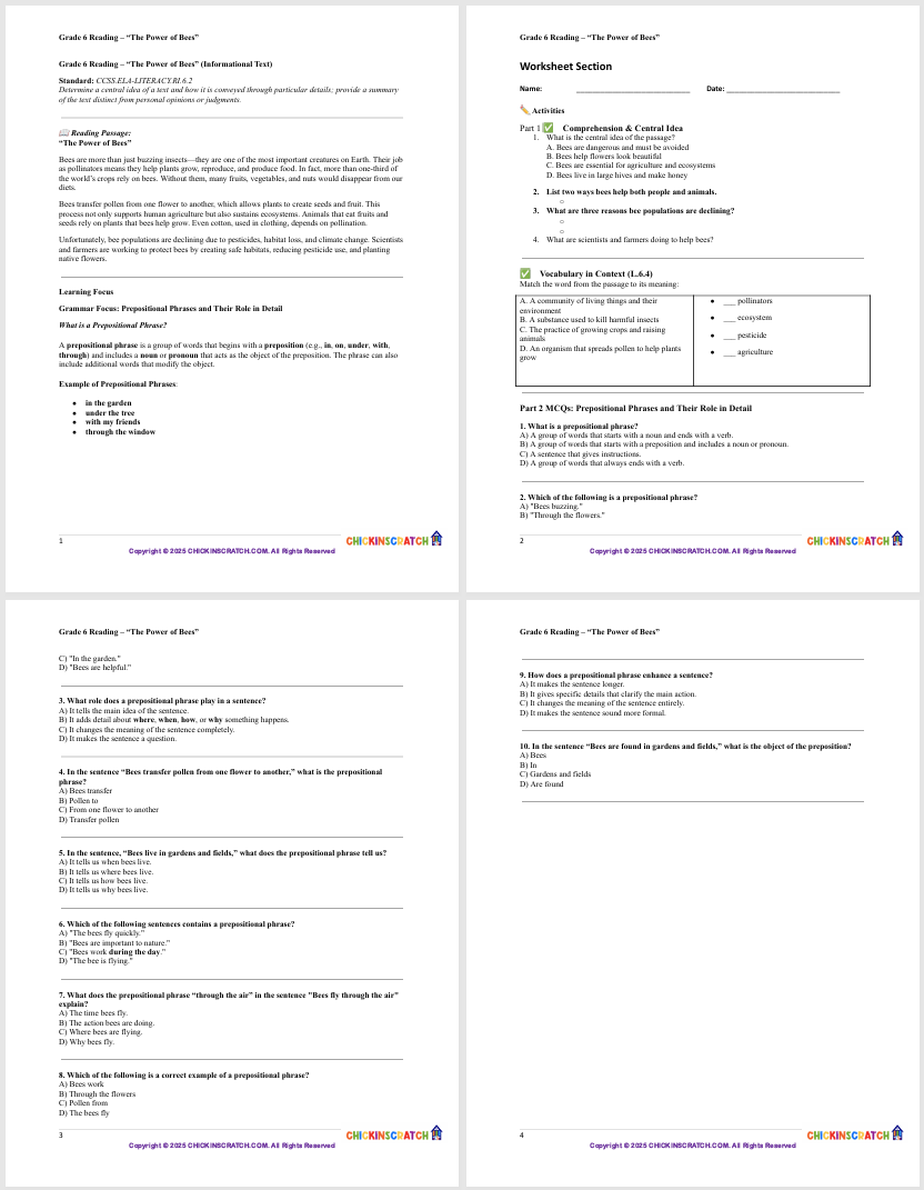 In these informational reading worksheets, 6th graders will explore “The Power of Bees,” learning how to determine the central idea and summarize key details. Students will build strong reading comprehension and critical thinking skills through text-based questions. Includes a complete answer key for easy checking—perfect for classroom use, homework, or extra practice!