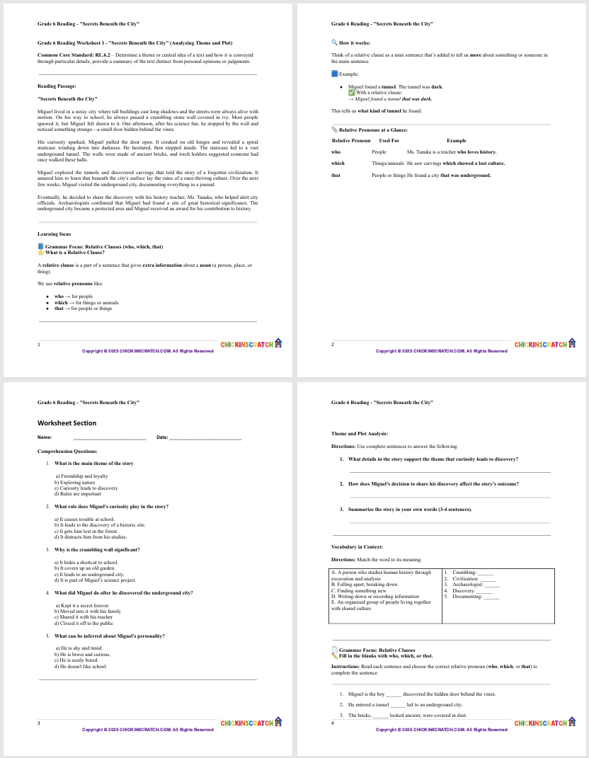 In this engaging reading worksheet, 6th graders will dive into the story “Secrets Beneath the City” to analyze its theme and plot development. Students will answer thoughtful questions that strengthen their skills in identifying key ideas and understanding how a story unfolds. Includes a full answer key for easy checking—perfect for classroom use, homework, or independent practice!