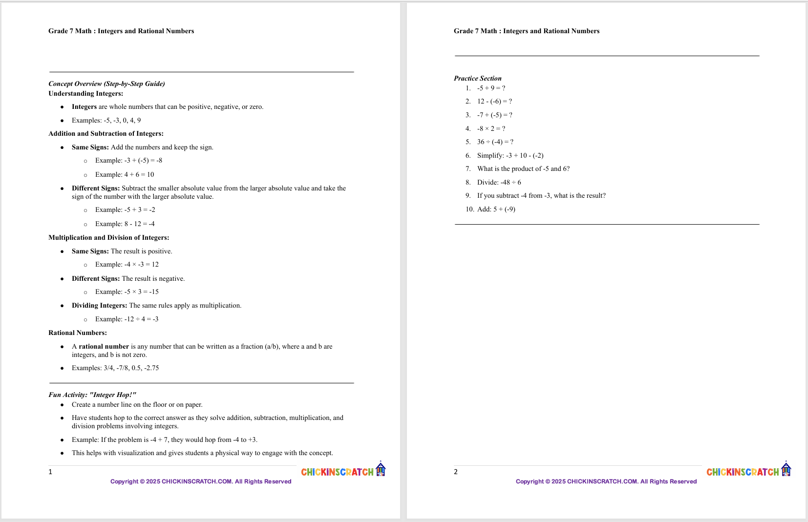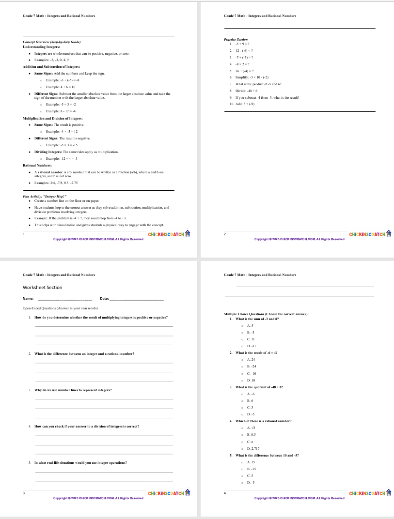 These worksheet sets help 7th graders master operations with integers and rational numbers, including positive and negative values, fractions, and decimals. Students will practice adding, subtracting, multiplying, and dividing through a variety of engaging problems. A complete answer key is included for easy grading or self-checking—perfect for classroom work, homework, or extra practice!